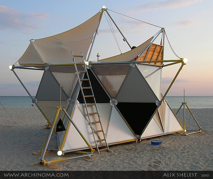 Tetrahedral Archinoma modules covered with tent membranes make it possible to gang up extremely weird buildings using limited supply of simple elements.
